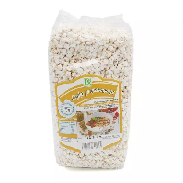 Gryka to zboże o wyjątkowych właściwościach prozdrowotnych. Zawartość białka w gryce wynosi ok. 10-18%. Białko to charakteryzuje się wysoką jakością i według danych, stanowi aż ponad 80% wartości żywieniowej białka jaja kurzego, które uznawane jest za białko wzorcowe o składzie aminokwasowym najbardziej optymalnym dla potrzeb organizmu człowieka. Badania dowiodły, że produkty gryczane dostarczają człowiekowi wystarczającą ilość aminokwasów egzogennych (czyli takich, których organizm ludzki nie jest w stanie syntetyzować), aby pokryć na nie w pełni zapotrzebowanie. Tak korzystny skład aminokwasowy wpływa na obniżenie cholesterolu we krwi oraz podwyższenie „dobrego” cholesterolu HDL. Dodatkowo, białko gryki nie zawiera frakcji glutenu. Powyższe właściwości sprawiają, że gryka i produkty gryczane są zalecane osobom z nietolerancją glutenu. Gryka zalicza się do węglowodanów złożonych, a zatem podczas trawienia cukry są uwalniane powoli, nie podnosząc gwałtowanie insuliny. Posiada witaminy z grupy B oraz cenne mikroelementy (magnez, żelazo, cynk, potas, fosfor). Bogata w flawonoidy, wykazuje wysoki potencjał antyoksydacyjny, który odgrywa ważną rolę w zapobieganiu powstawania zmian miażdżycowych oraz procesów nowotworowych. Najwartościowsza z kasz, zawiera w sobie bogactwo walorów smakowych i naturalnych składników. Jest znakomitym składnikiem sałatek, gołąbków, zup i gulaszów. Doskonale sprawdza się jako dodatek do obiadów i dań z warzyw. Wyśmienicie smakuje z dodatkiem pieczarek, boczku lub po staropolsku z miodem. Zalety naszej kasza gryczanej sprawiają, że powinna znaleźć miejsce w każdej kuchni. Ma delikatny, lekko orzechowy smak, znakomita na sypko, stosowana w dietach różnego rodzaju. Gryka preparowana to idealna przekąska do bezpośredniego spożycia, jako dodatek do musli, mleka, jogurtów, deserów. Produkt może zawierać śladowe ilości orzeszków ziemnych, innych orzechów, sezamu, soi oraz glutenu.