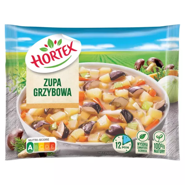 Zupa grzybowa. Mieszanka warzywna z grzybami. Produkt głęboko mrożony. Zawiera: Seler Może zawierać: Zboża zawierające gluten, Jaja, Mleko, Gorczyca, Soja Spożywać po obróbce termicznej Gotować we wrzątku - Od postaci zamrożonej - bez rozmrażania Garnek: Do 750 ml gorącego bulionu lub wywaru wsypać zawartość opakowania, dodać 4 ziarenka ziela angielskiego, 2 liście laurowe, 10 ziarenek pieprzu. Gotować ok. 12 minut. Pod koniec gotowania doprawić do smaku solą. Do zupy można dodać śmietanę i łazanki. Kulinarne inspiracje Hortex Zupa grzybowa z oliwą truflową Składniki: - Zupa grzybowa Hortex - 1 opakowanie - Włoszczyzna paski Hortex - 1 opakowanie - 1 l bulionu np. grzybowego - 200 g pieczarek - 50 ml śmietany 30 % - 50 ml białego wytrawnego wina - 40 ml oliwy truflowej - 2 białe cebule - 1 pęczek koperku - 0,5 g szafranu - olej rzepakowy - sól, pieprz Gotowe w 50 minut Przygotowanie: Pieczarki oczyść i pokrój na ćwiartki. Cebule pokrój w drobną kostkę, podsmaż na oleju na złoty kolor i przełóż do garnka. To samo zrób z włoszczyzną, zupą grzybową i pieczarkami. Wszystkie podsmażone składniki przełóż do jednego garnka, zalej bulionem i gotuj. Na patelnię, na której smażone były warzywa wlej wino, wsyp szafran i szybko zagotuj i odstaw. Do garnka z bulionem dodaj śmietanę i zaparzony w winie szafran, całość dopraw do smaku solą i pieprzem. Na koniec dolej oliwę truflową. Zupę podawaj ze świeżo posiekanym koperkiem. Chronić przed rozmrożeniem. Nie zamrażać powtórnie. Sposób przechowywania w warunkach domowych (temperatura / okres przechowywania) *-6 °C - 1 dzień ** -12 °C - 2 tygodnie *** poniżej -18 °C - do daty podanej na opakowaniu Przechowywać w temperaturze poniżej -18 °C