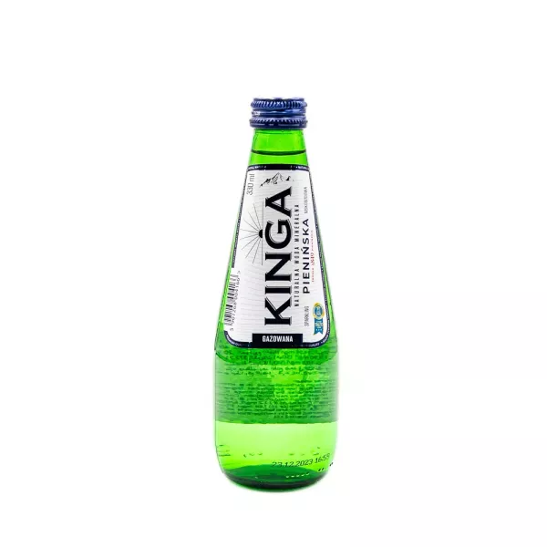Naturalna woda mineralna gazowana w szklanej butelce.