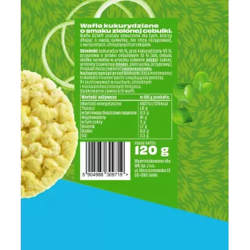 Wafle kukurydziane o smaku zielonej cebulki to produkt niskotłuszczowy - zawierają jedynie 1,8 g tłuszczu w 100 g produktu. Nie zawierają natomiast glutenu. Powstały bez dodatku glutaminianu monosodowego.