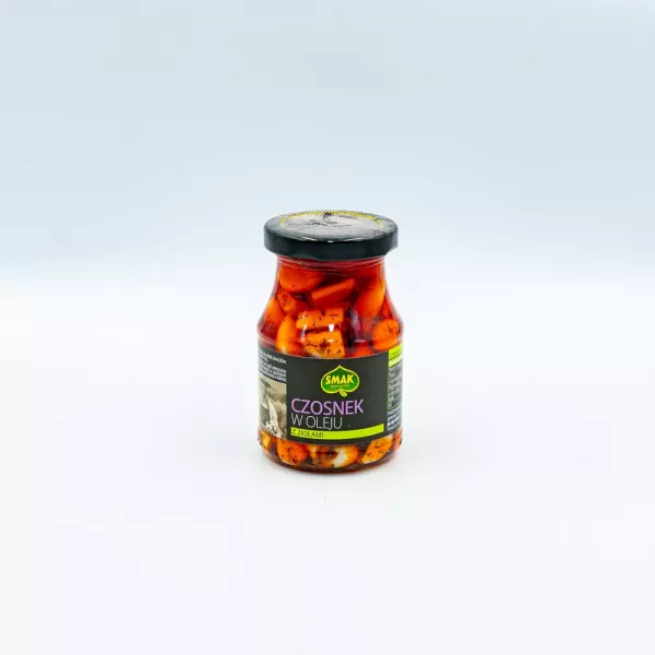 Czosnek w oleju z ziołami. Może zawierać jaja, soję, mleko (łącznie z laktozą), seler, gorczyce i orzeszki ziemne.
