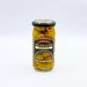 Zielone oliwki nadziewane pastą paprykową w zalewie. Może zawierać orzechy.