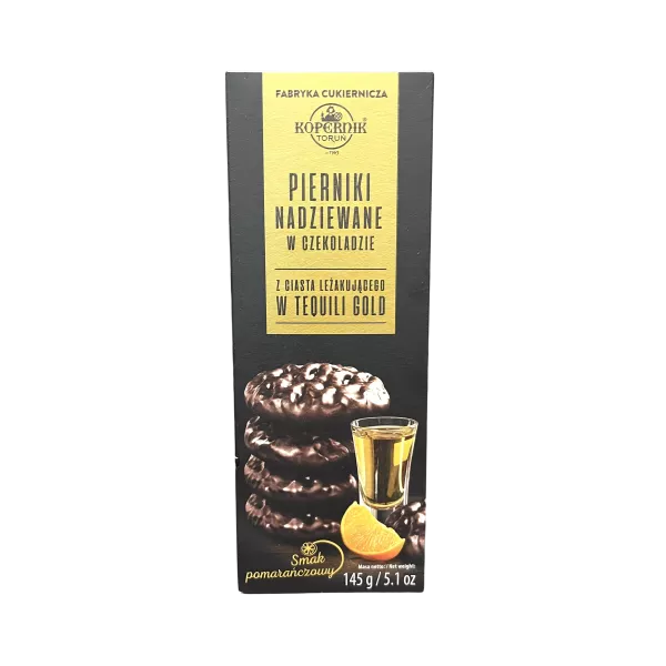 Pierniki w czekoladzie z nadzieniem o smaku pomarańczowym z ciasta leżakującego w tequili gold. Może zawierać : jaja, mleko, orzeszki arachidowe, migdały i inne orzechy, nasiona sezamu.