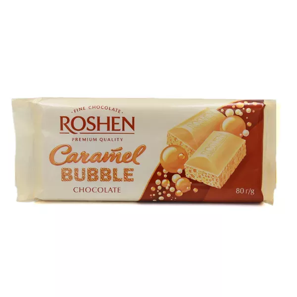 Czekolada Roshen biała z bąbelkami o smaku karmelowym. Może zawierać gluten (z pszenicy), jaja, orzeszki ziemne, nasiona sezamu, orzechy laskowe, migdały.