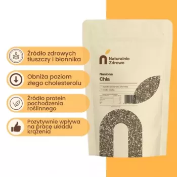Chia to świetny produkt spożywczy, który z łatwością wchłania wodę i tłuszcz, wykazując właściwości zagęszczające. Jest naturalnym źródłem wartościowego białka, ma niską zawartość cukru i nie zawiera soli (zawartość soli wynika wyłącznie z obecności naturalnie występującego sodu). Odznacza się wysoką zawartością składników mineralnych.
