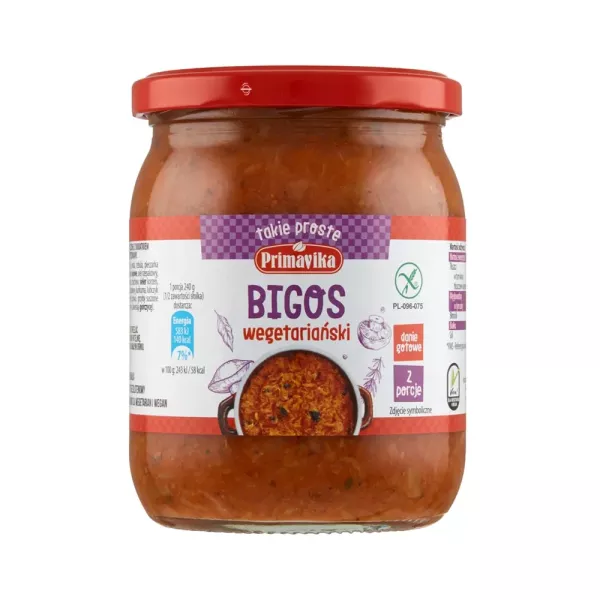 Poszatkowana kapusta biała i kiszona, połączona z drobnymi cząstkami suszonych grzybów i śliwek oraz teksturatem sojowym. Produkt pasteryzowany. Źródło białka. Opakowanie zawiera 2 sugerowane porcje.