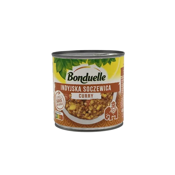 Namoczona suszona soczewica 39%, woda, mleko kokosowe, smażone bakłażan 6,2% (bakłażany 5,8%, olej słonecznikowy), przecier pomidorowy, czerwona papryka 4,9%, orzech piżmowy 3,1%, olej słonecznikowy, sól, mieszanka przypraw curry 0,5%, czosnek w proszku, imbir w proszku 0,22%, błonnik lniany, skrobia kukurydziana, cukier, koper włoski, ostra papryczka chili 0,05%, kurkuma 0,04%. Może zawierać gluten, seler, gorczycę.