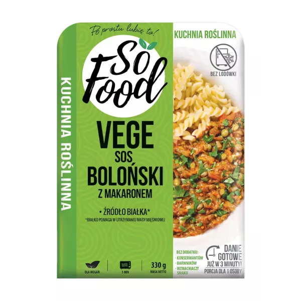 Vege sos boloński z makaronem jest równie pyszny w wersji wegetariańskiej, dlatego przygotowaliśmy So Food VegeSos Boloński, gdzie zamiast mięsa wykorzystujemy soczewicę.